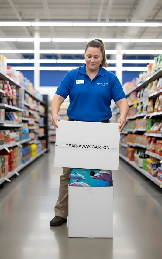 Instead of paying for an inner display box (PDQ) plus an outer shipping carton, we engineer a single, high-strength corrugated master carton featuring strategically placed perforated lines. When the container arrives, floor staff simply rip off the top half. Instantly, it transforms into a retail-ready PDQ display tray.